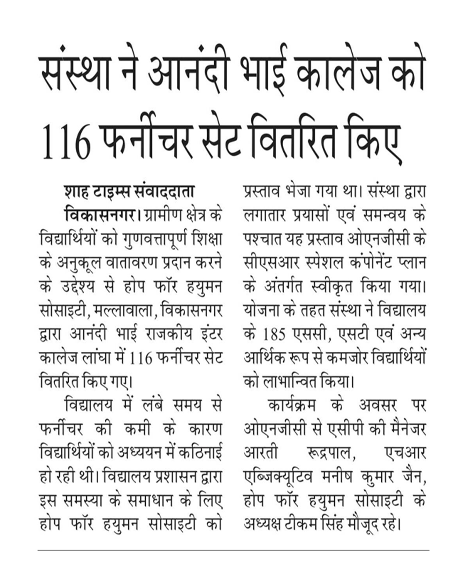 कॉलेज को 116 सेट फर्नीचर वितरित किए गए