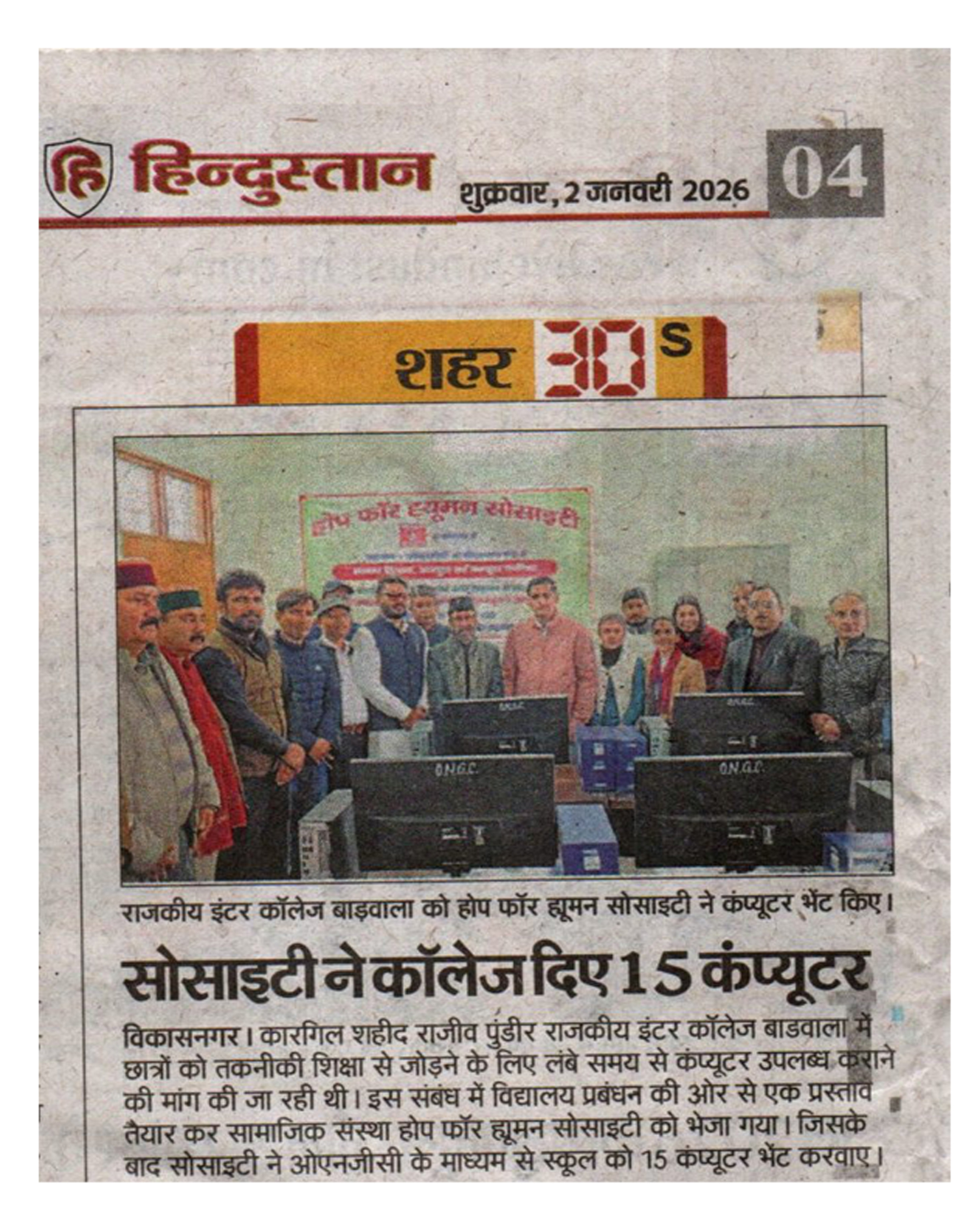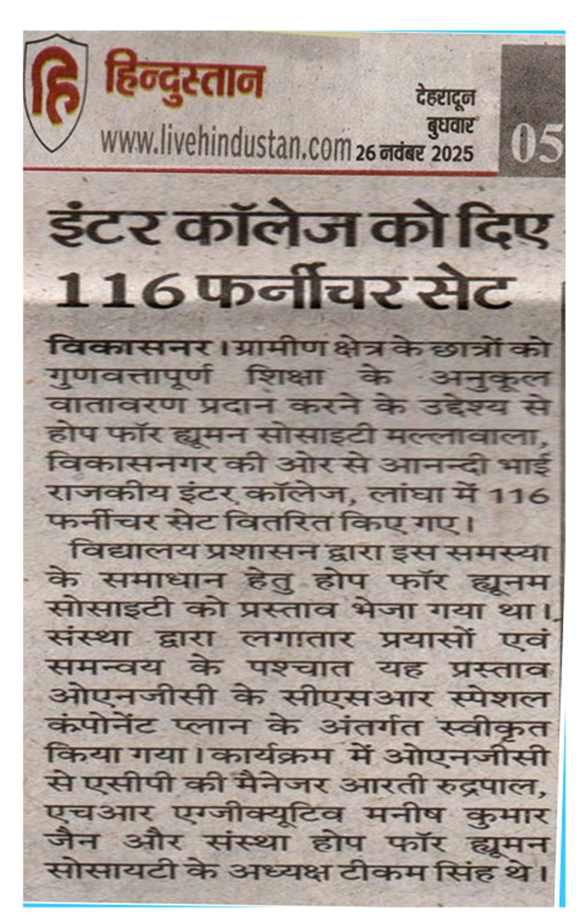 सोसाइटी द्वारा कॉलेज को फर्नीचर एवं कंप्यूटर वितरित किए गए